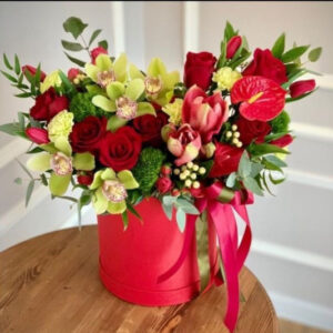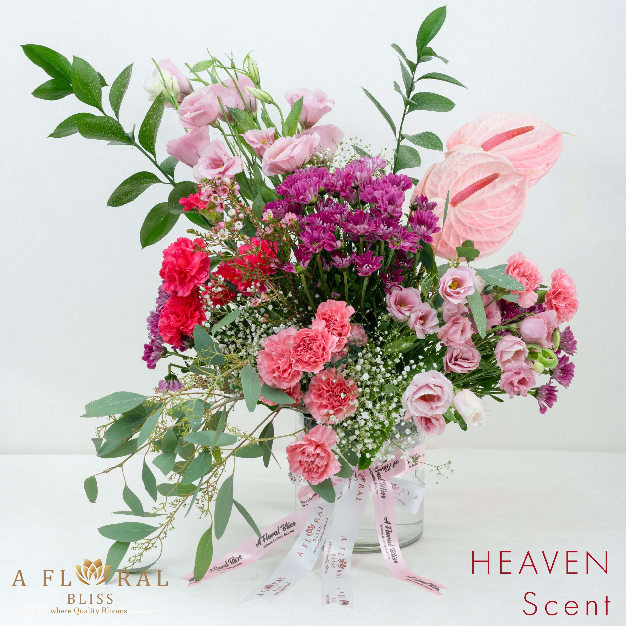 The “Heaven Scent” floral arrangement is a delightful blend of soft, romantic hues and delicate blooms, creating an ethereal and enchanting display. This beautiful arrangement features:
