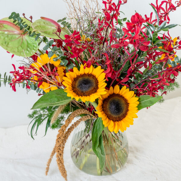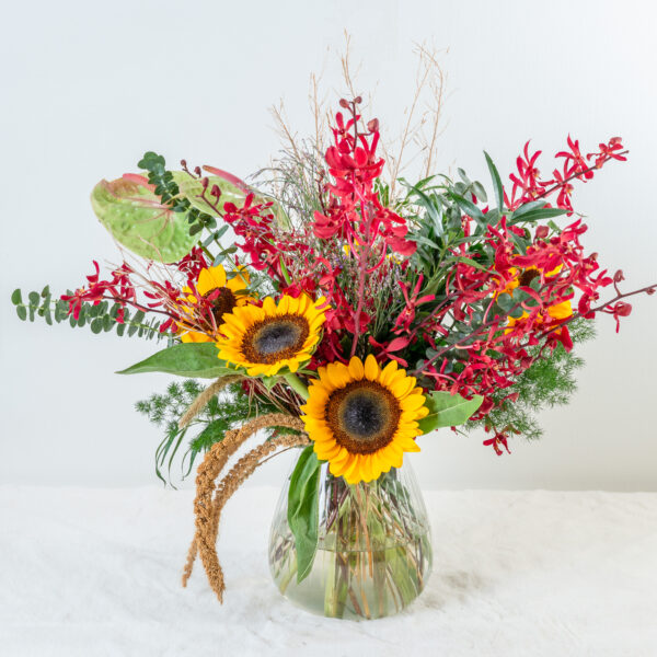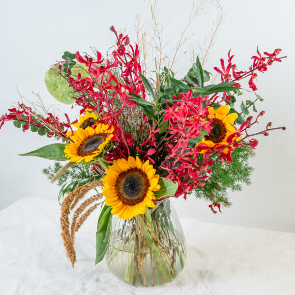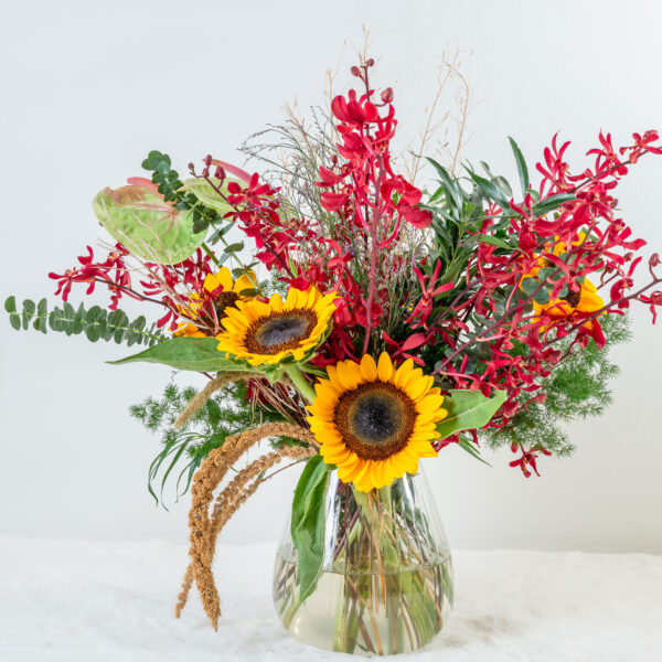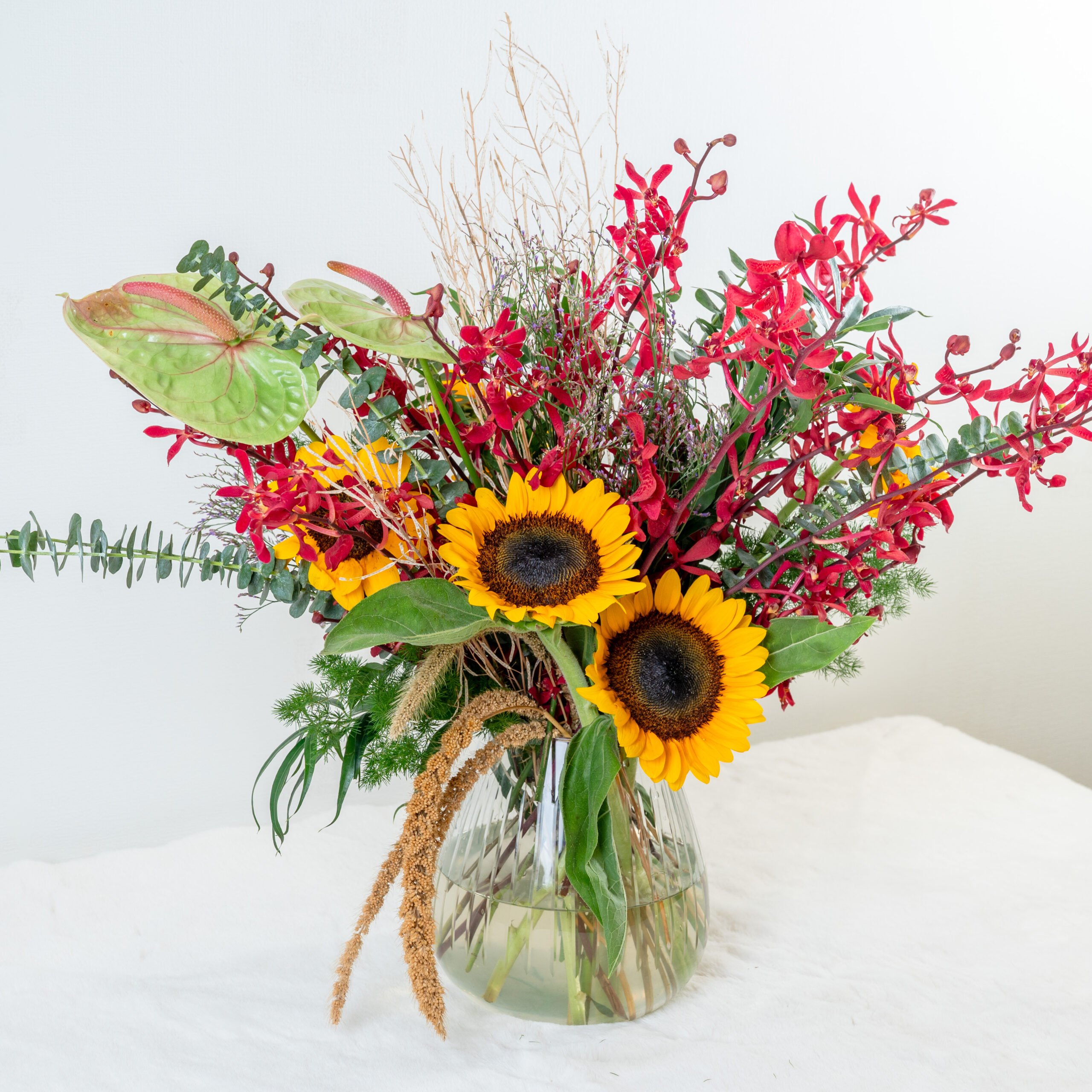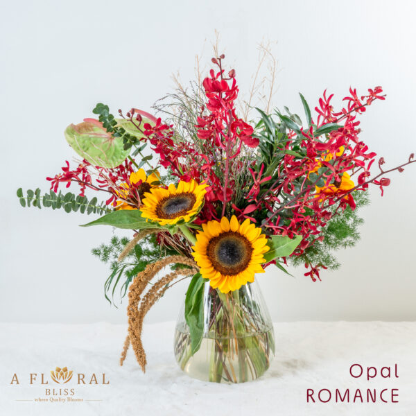 The Opal Romance is a bright and charming glass vase bouquet of 26 stems, blending vibrant yellows, striking reds, and lush greens. Designed with a balance of bold flowers and rustic fillers, this arrangement brings a joyful and romantic vibe to any occasion.
