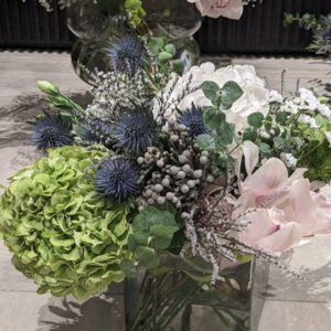 Flowers Used : Hydrangea, Limonium Purple, Limonium White, Button Daisies, Roses.